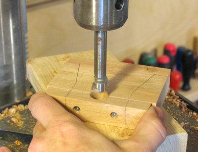 After screwing the top part of the bearing block on, I drilled the shaft hole