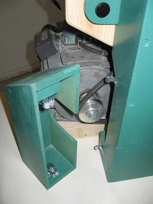 Tamás Peto I used different types of wood for the bandsaw. The frame is made of pine, the guide and the wheel mounts are made of acacia, and I used plywood as well. Since the right top post of frame got warped, I couldn't apply the wheel mount frame in your plan, so I had to create an other one, that I screwed on to the posts. On the bottom of wheel mount I fixed another piece of hardwood in order to keep the wheel firm together with the other clamp bolt. I modified the enclosure of the bandsaw too: mine is entirely made of plywood, with a piece of sheet metal for the blade cover. There are separate frames for both the top and bottom enclosure with attachment lugs. Nevertheless, they are not as easily removable as yours, except the belt cover, which I equipped with a door latch.
