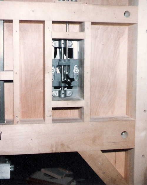 "I used a hinge on the lower wheel bearing mount as a concession to Mr. Gilliom. He was of the opinion that the lower wheel of a bandsaw should be tilted a degree or two off vertical to counter the upward pull of blade tension and the force of pulling a blade through wood being sawn; his own saw design allowed for this and out of politeness I didn't tell him that it needed that because it just wasn't rigid enough. :-) For my part I wasn't sure one way or the other. I had noticed that the lower wheel seemed tilted in a number of manufactured saws that I had had experience with, but I didn't know if that was by intent; I had never seen a saw that had any means of making such an adjustment either, although some do allow to move the shaft sideways. I bored some additional screw holes in the hinge leaf which attaches to the frame and ran in some long, hex-head lag screws - 2 1/2 or 3 inches. Not visible in the photos, but inside the motor cabinet, are a couple of vertical studs attached to the panel on the back of the frame, on either side of the bearing mount, which give support to the rear of the drive."