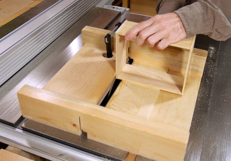I'm using my old small table saw sled, which has a wide slot in the bottom from having cut dadoes with it. I clamped a board on the right side to act as a stop just above the blade. Pushing the box against the stop positions it so the blade flush trims the corner.