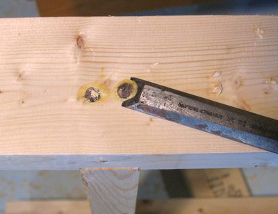 I pounded the dowels but left them sticking about 1 mm out of the surface. This made trimming them flush with a chisel rather easy.