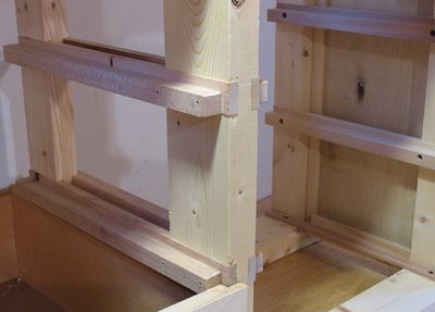 This shot shows the drawer guide rails screwed in. I had to trim them back a little bit, because of how the rabbeted drawer fronts were shaped. This allows the drawer to slide back far enough so that the drawer front touches the frame.