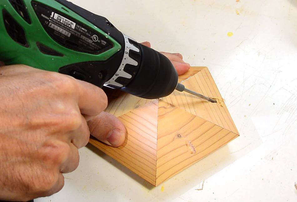 I rigged up a temporary pocket hole jig out of wood. I'm drilling 17/64" (7 mm) holes for a #4 screw.