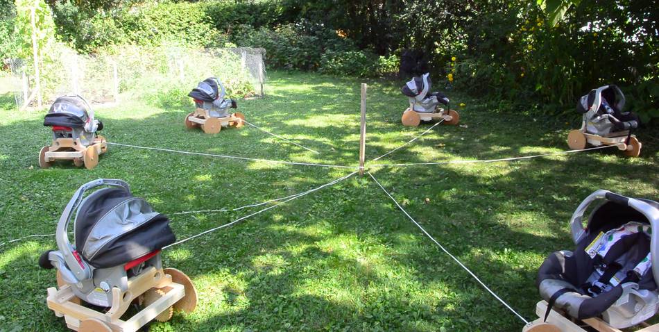 Our baby Harriet really likes car rides and stroller rides, so I was thinking of a machine to simulate that. Ideally, with some slow turning bumpy cams to make for irregular motion. My next thought was to make something that slowly pulls the stroller across a bumpy lawn, and from that, figured, why not some sort of motorized carriage to drive the baby in circles on the lawn?