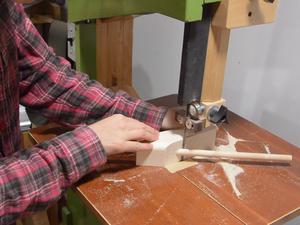 Here she's drilling a 1/2" hole in a scrap of wood, which she then cut off at 55 degrees (from square) on the bandsaw.
