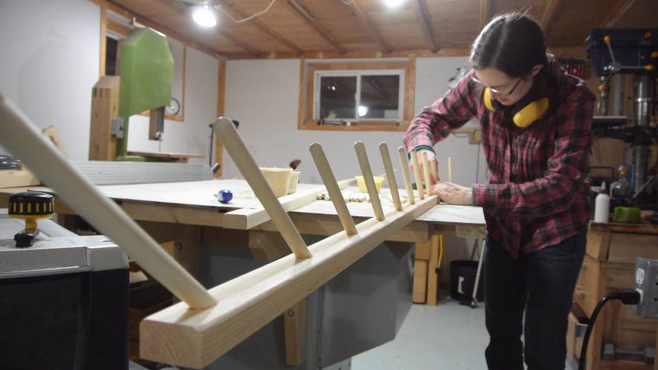 I did however experiment with putting a few dowels in a board at an angle, just to try out a particular angle and spacing. I also made a jig for drilling those 45-degree angle holes, which Rachel is showing at right, along with my experiment.