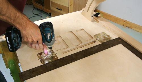 Je vérifie la position des charnières avec l'équerre. Il est nécessaire d'en décaler légèrement une.