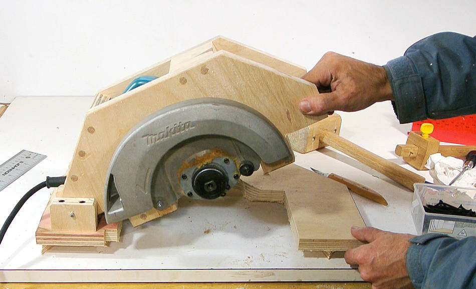 Checking that the alignment is good, with the saw blade parallel to the plywood.