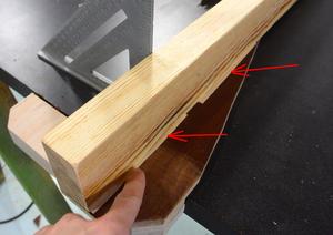 Gluing the triangular fence brace to the front bracket. Because I'm using wood that was varnished, I need to sand it where I'm gluing. However, any wood that's been lying around for a long time should get a light sanding before gluing to ensure good glue adhesion.