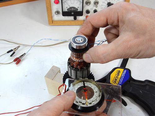 Here I'm applying a current, using thin telephone wires pushed against the commutators and checking the magnetic field with a compass. If I change where I'm applying the current (to different commutators) them magnetic field also rotates to line up with the commutators I'm applying current to.