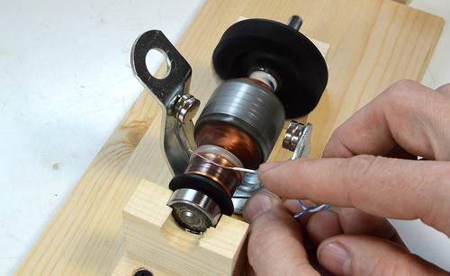 Next I applied 30 volts to the rotor, and that got it spinning scary fast, considering it's just sitting loosely in this arrangement. But universal motors, in real operation, usually run at about 100 to 200 turns per second.