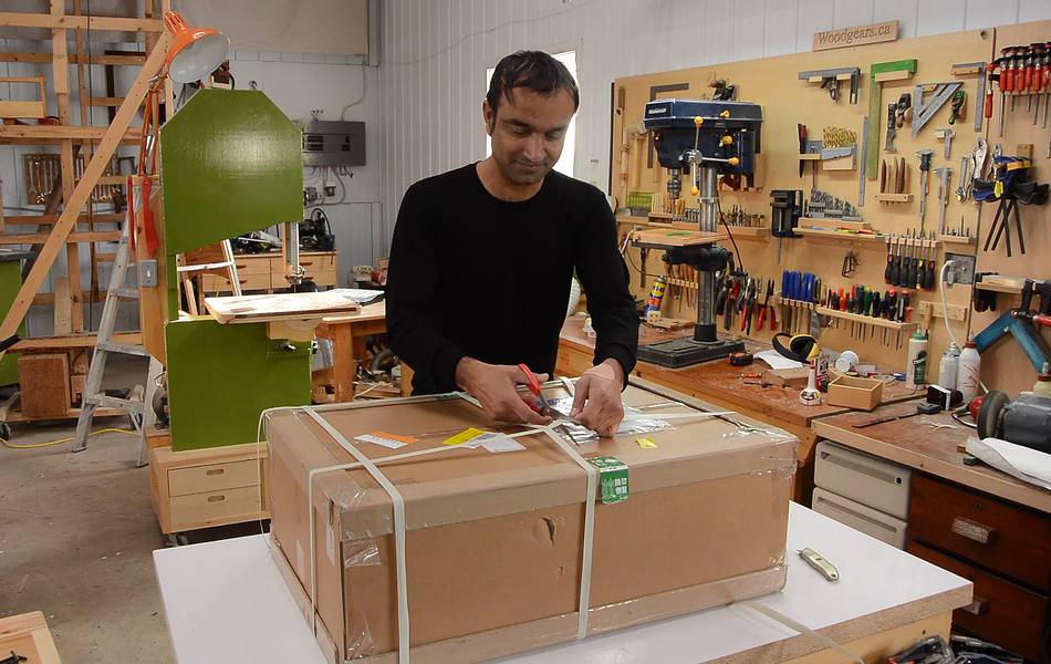 Here Kuldeep is adding the table. The table supports and angle adjust protractors were already mounted to the base in the box.