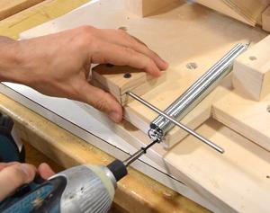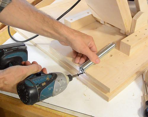 The hinge with the link could be a piece of steel rod or a wood screw. I'm using part of a knock-down fastener screw. I like the large head on it, and the smooth shank will make a nice pivot.