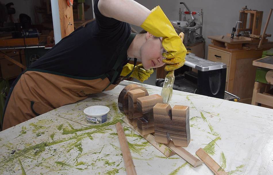 Varnishing the letters with water based varnish. The walnut colour would come out better with oil based varnish, and it would stand up better to getting put in a baby's mouth. But it's winter, and the oil based varnish is smelly, so we used the water based varnish.