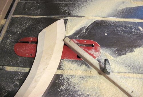 Because the sword is curved, I couldn't just do a regular rip cut to cut a bevel on the sides. Instead, I used more of a cove cutting technique. I passed the sword sideways over the blade, each time raising the blade by about a millimeter. I attached a stop, which is held into the T-slot to help guide the sword and keep it from getting pulled into the saw blade. I cut it on the back side of the saw blade, which pulled the blade against my stop. In retrospect, a safer thing would have been to pass the sword on the front side of the saw blade, which would have pushed the sword away from the blade.