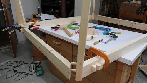 Apron rails, legs and dowels all ready for glue-up.