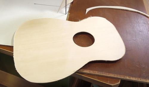 Next I decided to trim my sound board to near its final shape. I used my bandsaw for this. To avoid getting tear-out on the front, I cut slightly into a sheet of material to act like a zero clearance bandsaw insert. I can also make zero clearance inserts for my saw, but they don't stay "zero clearance" for that long, so this method is more convenient.