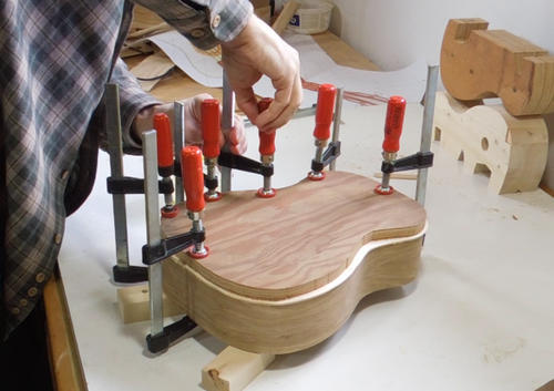 I realized that clamping the lining on could cause the body to distort a little, so I traced around the shape of the body with a pencil and cut that shape out of a scrap of plywood. I clamped that plywood around the body to preserve its shape. So I ended up making a simple sort of external mold after all.